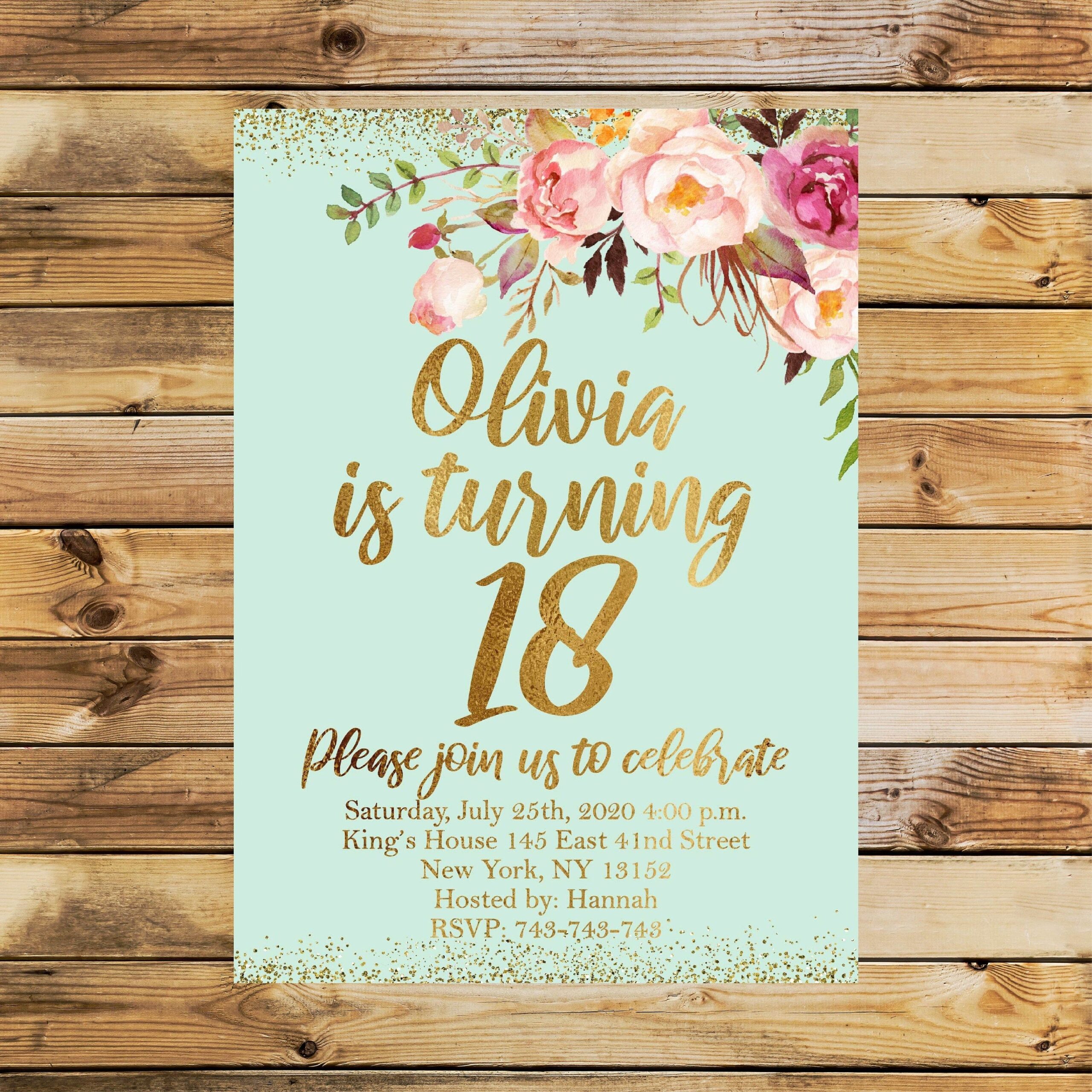 Editable 18th Birthday Invitation Eighteenth Birthday Floral Mint